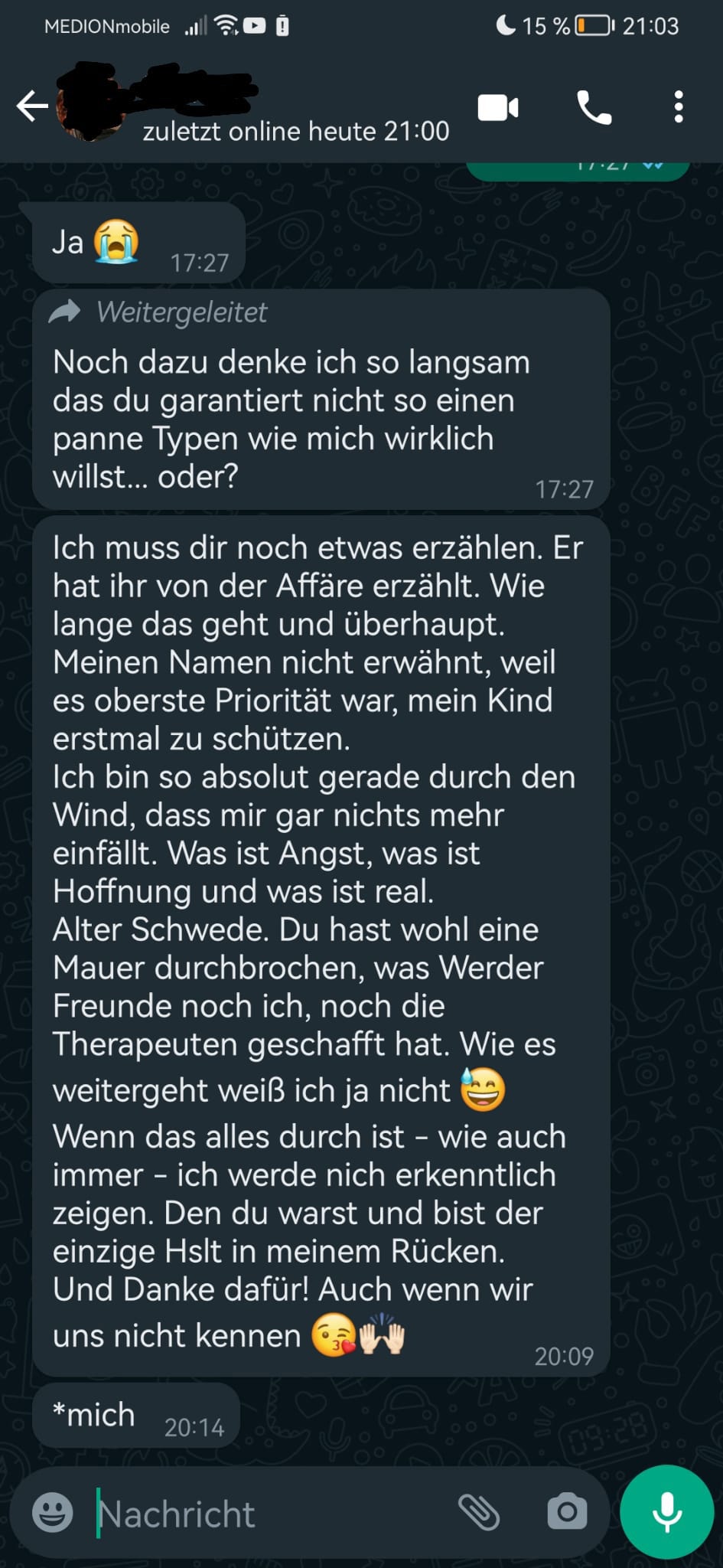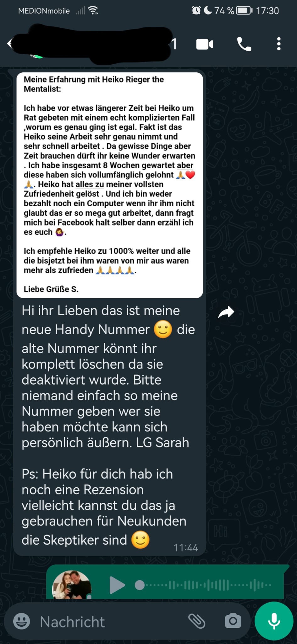Gerne darfst Du mich sofort anrufen oder anschreiben via WHATSAPP! Meine Notfallnummer ist Tag und Nacht erreichbar! 0157/54951468. Da ich oft im Klientengespräch bin, melde Dich bitte über den untenstehenden Button und schreibe mir Deine Trennungsgeschichte. Du erhältst direkt im Anschluss mein kostenloses Soforthilfepaket (PDF) und ich schreibe Dir meine erste Einschätzung für die Erfolgsaussichten der Partnerrückführung. Bezahlung erfolgt via Banküberweisung an "Psychic Entertainment Heiko Rieger" im voraus.