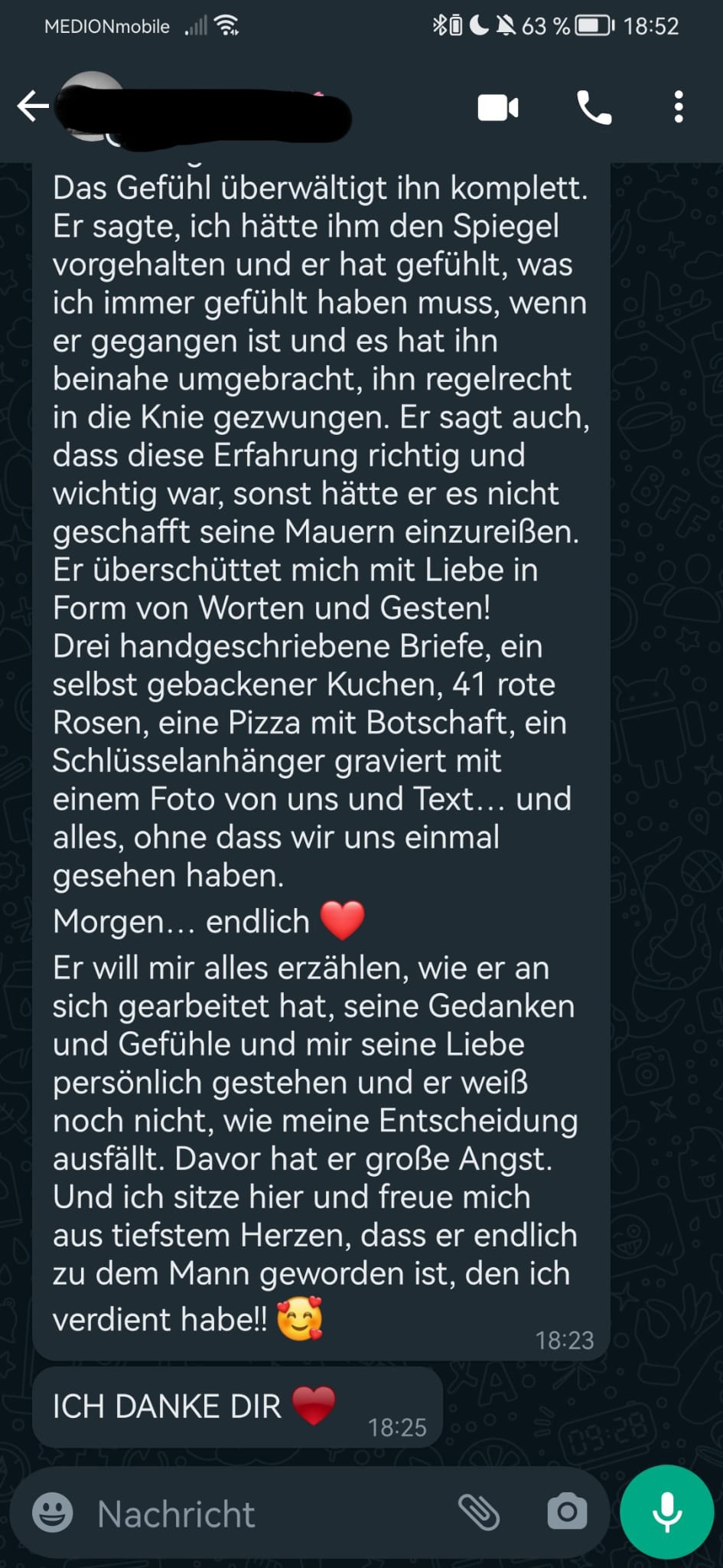 Vertrauen ist mir sehr wichtig, um gemeinsam mit meinen Klienten deren Ziel zu verfolgen. Ich höre mir Deine Geschichte gerne kostenlos und unverbindlich am Telefon an um dann eine Expertise abzugeben. Gemeinsam erarbeiten wir dann einen intelligenten Plan, damit Du nicht mehr "in der Luft" hängst und weisst, wie wir die kommenden Tage vorgehen. Ich betreue Dich in dieser Zeit kostenlos, damit Du diese schwere Zeit bis sich der Ex-Partner meldet, nicht alleine durchstehen musst, sondern immer einen kompetenten und professionellen Ansprechpartner an der Hand hast. Wurdest Du verlassen oder hast ein anderes Problem? Gemeinsam finden wir eine Lösung. Anderen Menschen mit meiner Technik zu helfen ist meine oberste Priorität. Deshalb arbeite ich sehr günstig.